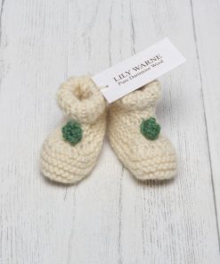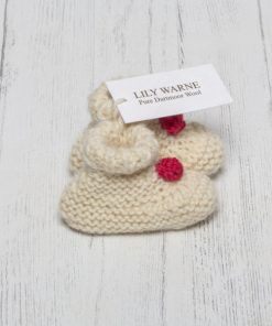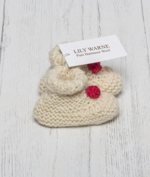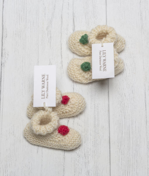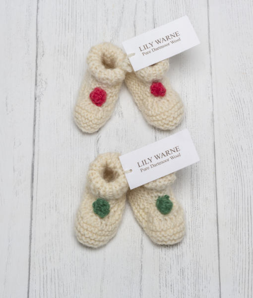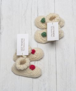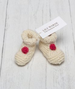 Hand Knitted in the softest Blue Faced Leicester wool in Chagford Cream these pull on gorgeous booties look just adorable, chose from either Sandypark Scarlet or Devon Green knitted poms sewn on the front to give a elegant nod to the festive season and one for the memory box.